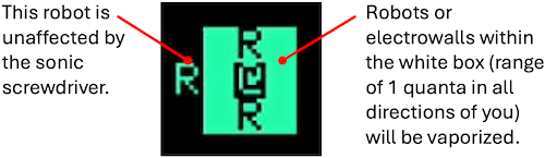 A sonic screwdriver, which you can use to disintegrate robots and deactivate electrowalls within 1 quanta (space) of the player. The sonic screwdriver has limited use. You gain one additional sonic screwdriver use per each level completed. The sonic screwdriver has a proximity circuit, and it will not fire unless a robot or electrowall are within one quanta range.